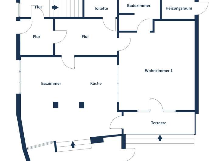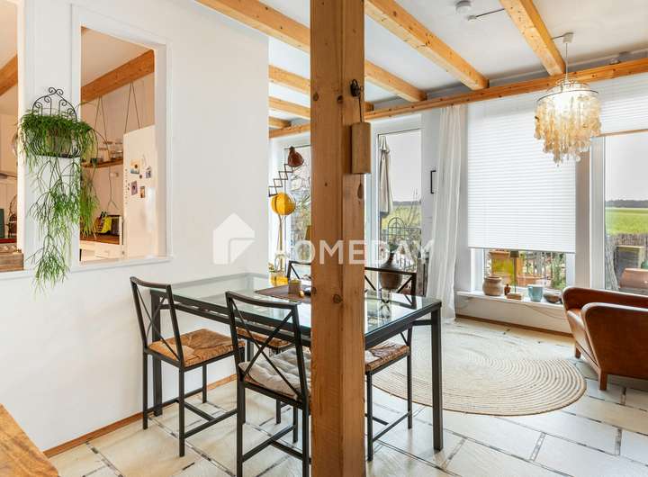 Im Inneren empfängt Sie ein stilvoller Flur. Das anschließende Wohnzimmer beeindruckt mit Weite, großen Fensterfronten und wohliger Kaminwärme. Der Küchen- und Essbereich verfügt über alle Anschlüsse für eine neue Küche und wird durch ein Zwischenfenster zum zweiten Wohnzimmer zusätzlich aufgelockert. Das weitere Wohnzimmer ist ebenfalls mit einem Kaminofen ausgestattet und bietet ebenso behagliche Wärme. Ein Badezimmer, eine separate Toilette sowie ein Heiz-/Technikraum ergänzen das durchdachte Raumangebot.