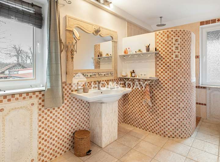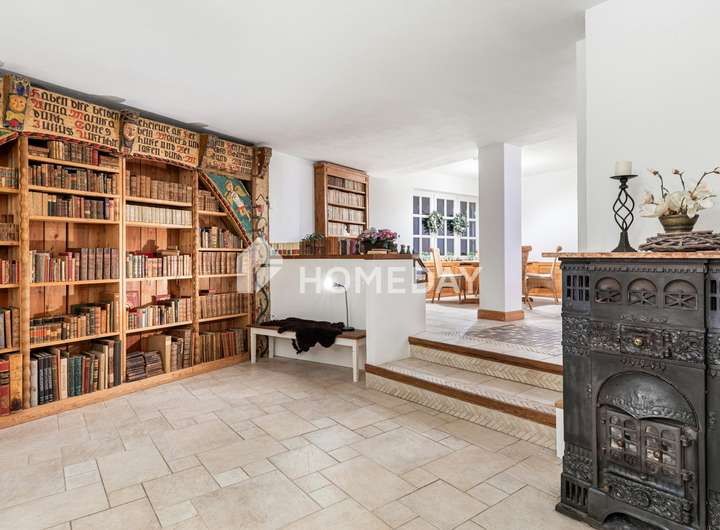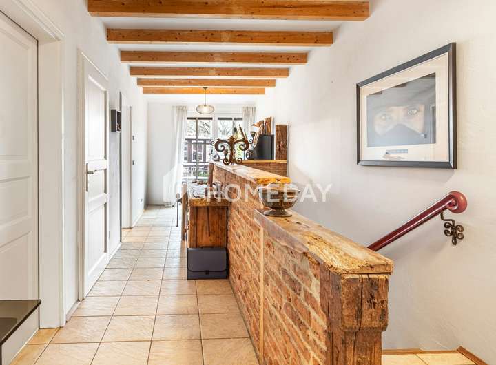 Das 2006 in massiver Bauweise errichtete Haus präsentiert sich äußerst gepflegt und verbindet gehobene Ausstattung mit charmanten, teils extravaganten Details. Feinsteinzeug in Natursteinoptik, Echtholzparkett (Rüster), sichtbare Holzbalken sowie insgesamt drei Kamine prägen die besondere Wohnatmosphäre. Technisch überzeugt die Immobilie mit einer Gaszentralheizung, überwiegend Hartholzfenstern mit Zweifachverglasung sowie zwei voll ausgestatteten Einbauküchen.