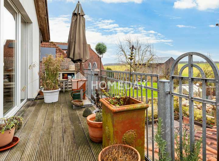 Die weitläufige Südterrasse aus Naturstein vermittelt Urlaubsgefühl pur. Der kunstvoll gestaltete Sandsteinbrunnen bildet das Herzstück des Gartens und sorgt für mediterranes Ambiente. Mehrere Terrassenbereiche bieten geschützte Plätze zum Entspannen, während die erhöhte Süd-Dachterrasse im Obergeschoss einen beeindruckenden Blick über die Felder eröffnet. Ein Balkon sowie ein Carport runden das Ensemble ab.