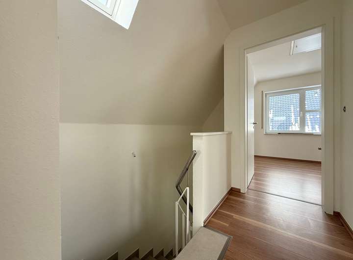 Die Doppelhaushälfte verfügt über vier großzügig geschnittene Zimmer, ein komfortables Badezimmer sowie praktische Nebenräume. Herzstück des Hauses ist der offen und freundlich gestaltete Wohnbereich, der durch zwei Fenster zum Flur und eine elegante Glastür zur Küche überzeugt. Die offenen Sichtachsen sorgen für viel Tageslicht und eine einladende Atmosphäre. Die erhöhte Deckenhöhe sowie die 2,12 m hohen Innentüren unterstreichen das moderne Raumgefühl im gesamten Haus.