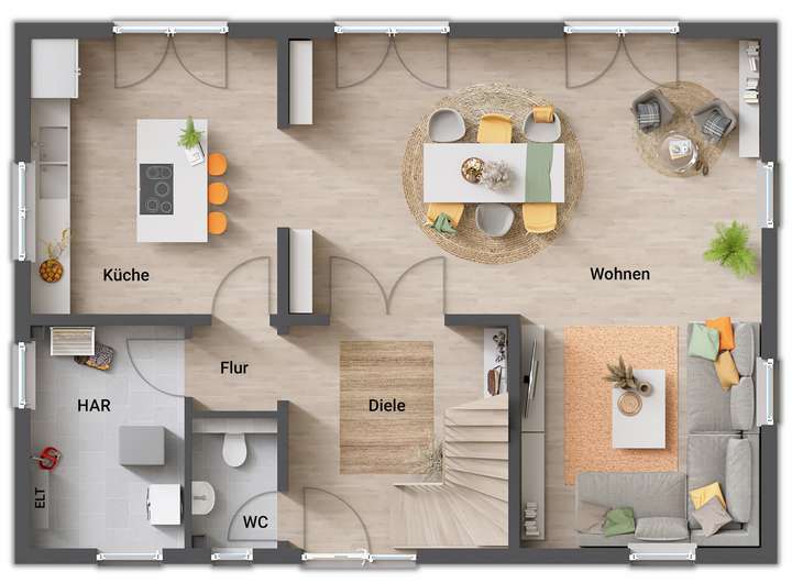 Das Landhaus 142 besticht durch sein ländliches Flair genauso wie durch seine zeitlose Eleganz. Hier findet garantiert jeder seinen Platz. Die großzügig geschnittenen, lichtdurchfluteten Räume auf beiden Ebenen warten nur noch auf Ihre Gestaltungsideen. Zu den Mahlzeiten trifft sich die ganze Familie in der Küche und auch das Wohnzimmer eignet sich hervorragend für gemütliche Stunden oder fröhliches Beisammensein.