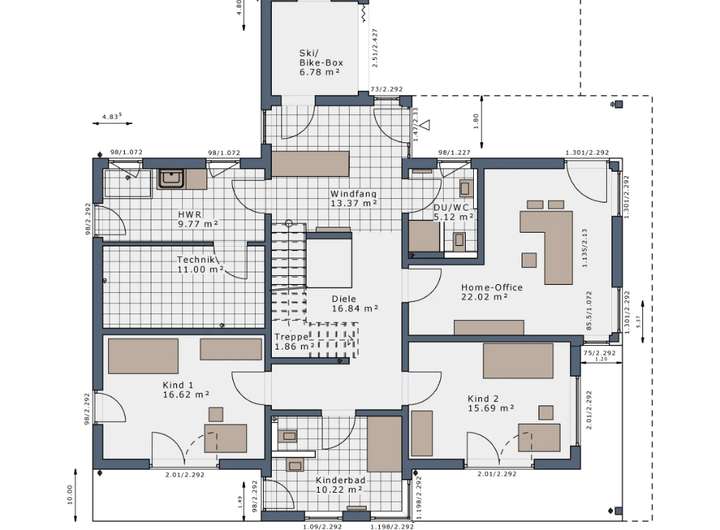 Die dargestellten Grundrisse verstehen sich als Beispiel/Vorschlag und können ohne Mehrkosten individuell umgeplant werden, insofern die Gesamtwohnfläche/bebaute Fläche gleich beleibt. Die Gesamt-Wohnfläche und Hausgeometrie/-Architektur kann gegen Preiskorrektur geändert angeboten werden. Die üblichen orts- und grundstücksabhängigen Bau- & Erwerbsnebenkosten sowie gewünschte Garagen/Carports sind hinzuzurechnen.