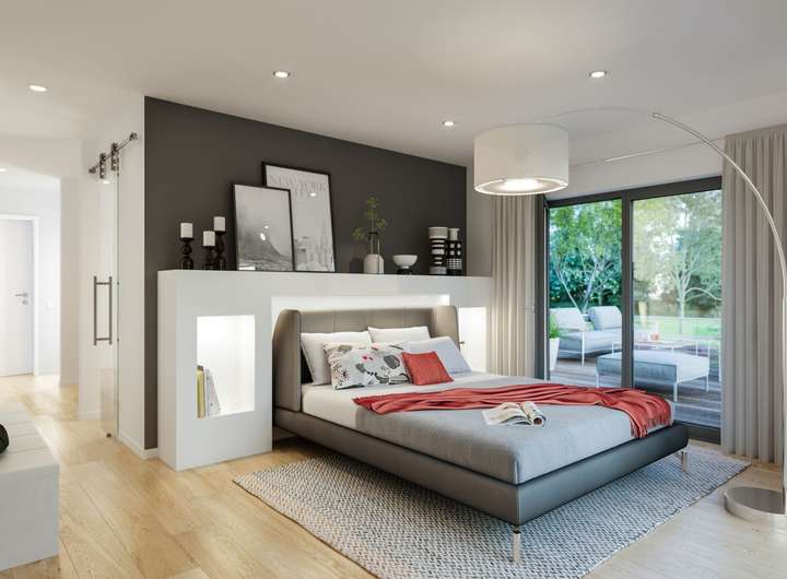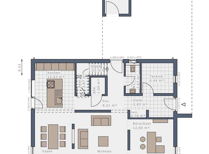 Die dargestellten Grundrisse verstehen sich als Beispiel/Vorschlag und können ohne Mehrkosten individuell umgeplant werden, insofern die Gesamtwohnfläche/bebaute Fläche gleich beleibt. Die Gesamt-Wohnfläche und Hausgeometrie/-Architektur kann gegen Preiskorrektur geändert angeboten werden. Die üblichen orts- und grundstücksabhängigen Bau- & Erwerbsnebenkosten sowie gewünschte Garagen/Carports sind hinzuzurechnen.