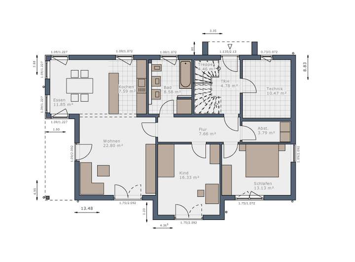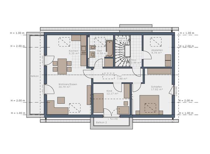 Die dargestellten Grundrisse verstehen sich als Beispiel/Vorschlag und können ohne Mehrkosten individuell umgeplant werden, insofern die Gesamtwohnfläche/bebaute Fläche gleich beleibt. Die Gesamt-Wohnfläche und Hausgeometrie/-Architektur kann gegen Preiskorrektur geändert angeboten werden. Die üblichen orts- und grundstücksabhängigen Bau- & Erwerbsnebenkosten sowie gewünschte Garagen/Carports sind hinzuzurechnen.