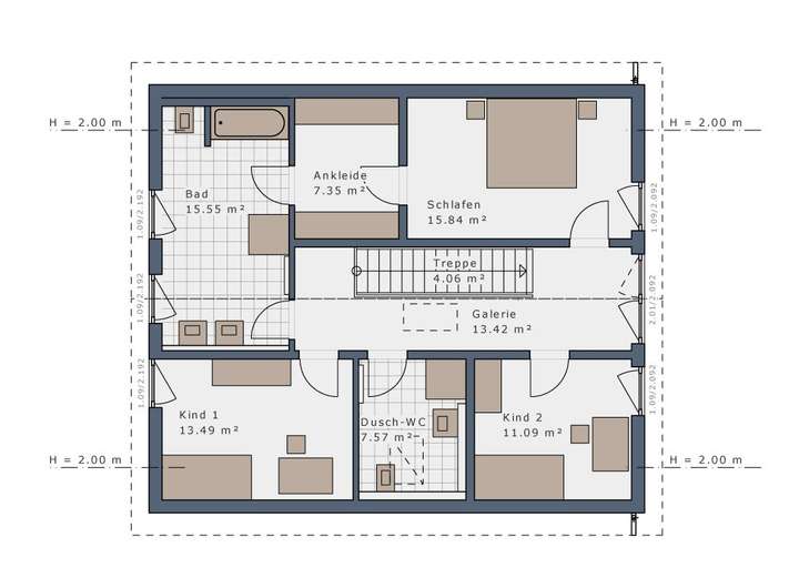 Die dargestellten Grundrisse verstehen sich als Beispiel/Vorschlag und können ohne Mehrkosten individuell umgeplant werden, insofern die Gesamtwohnfläche/bebaute Fläche gleich beleibt. Die Gesamt-Wohnfläche und Hausgeometrie/-Architektur kann gegen Preiskorrektur geändert angeboten werden. Die üblichen orts- und grundstücksabhängigen Bau- & Erwerbsnebenkosten sowie gewünschte Garagen/Carports sind hinzuzurechnen.