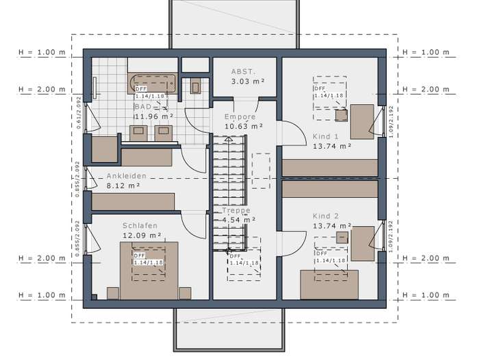 Die dargestellten Grundrisse verstehen sich als Beispiel/Vorschlag und können ohne Mehrkosten individuell umgeplant werden, insofern die Gesamtwohnfläche/bebaute Fläche gleich beleibt. Die Gesamt-Wohnfläche und Hausgeometrie/-Architektur kann gegen Preiskorrektur geändert angeboten werden. Die üblichen orts- und grundstücksabhängigen Bau- & Erwerbsnebenkosten sowie gewünschte Garagen/Carports sind hinzuzurechnen.