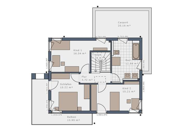 Anbauteile, Carport, Garage und Keller können Extras sein, die als Sonderausstattung angeboten werden. Abbildungen, Grundrisse und Flächenangaben sind beispielhaft und können Extras zeigen. Flächenangaben nach DIN 277.