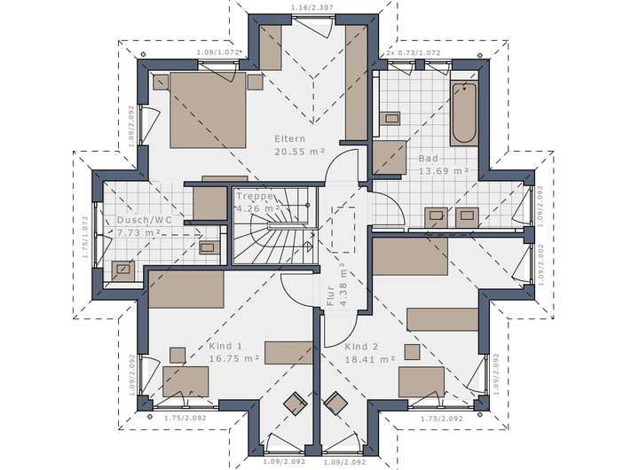 Anbauteile, Carport, Garage und Keller können Extras sein, die als Sonderausstattung angeboten werden. Abbildungen, Grundrisse und Flächenangaben sind beispielhaft und können Extras zeigen. Flächenangaben nach DIN 277.