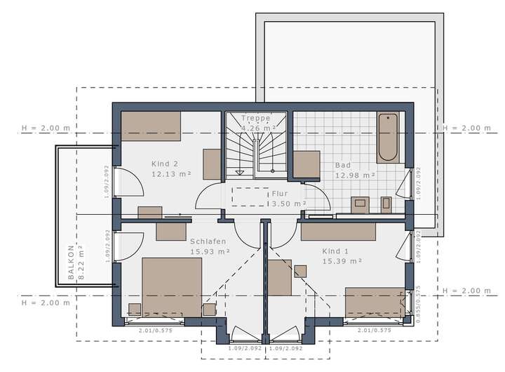 Die dargestellten Grundrisse verstehen sich als Beispiel/Vorschlag und können ohne Mehrkosten individuell umgeplant werden, insofern die Gesamtwohnfläche/bebaute Fläche gleich beleibt. Die Gesamt-Wohnfläche und Hausgeometrie/-Architektur kann gegen Preiskorrektur geändert angeboten werden. Die üblichen orts- und grundstücksabhängigen Bau- & Erwerbsnebenkosten sowie gewünschte Garagen/Carports sind hinzuzurechnen.