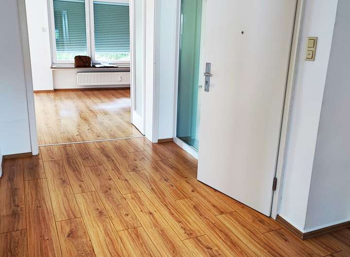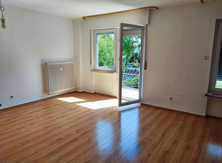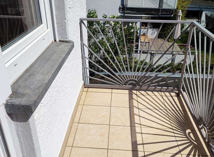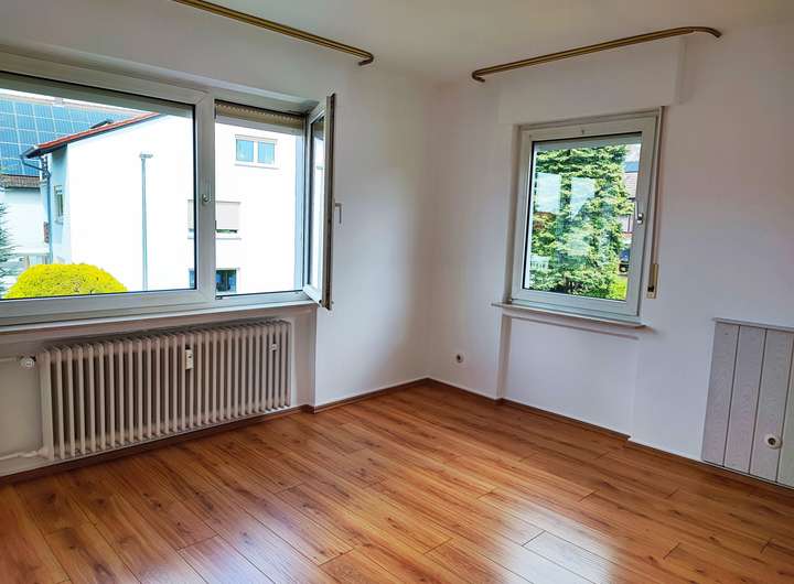 Im ersten Obergeschoss erwartet Sie ebenfalls eine großzügige Wohnung, die über drei lichtdurchflutete Zimmer verfügt. Diese Wohnung besticht zusätzlich durch einen Südbalkon, der mit einer neuwertigen Markise ausgestattet ist und somit auch bei direkter Sonneneinstrahlung einen kühlen Rückzugsort bietet. Die gut durchdachte Raumaufteilung umfasst außerdem eine moderne Einbauküche sowie ein Tageslichtbad mit Wanne. Ein zusätzlicher Einbauschrank im Schlafzimmer sorgt für praktischen Stauraum, während der geräumige Flur mit Flügeltür zum Wohn- und Essbereich einladend wirkt.