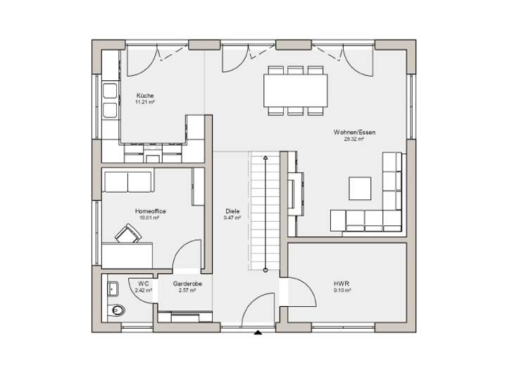 Gleich im Eingangsbereich zeigt die Stadtvilla Signus durch ihre Offenheit was sie zu bieten hat. Eine große Garderobe verstaut die Jacken und Mäntel der Bewohner sowie Besucher. Über einen langen Flur, vorbei an der geradläufigen Treppe, gelangen Sie in den Wohn-/Essbereich des Hauses, an den auch die offene Küche Anschluss findet. Von hier bieten die bodentiefen Fenster einen herrlichen Blick in den Garten. Des Weiteren befindet sich im Erdgeschoss ein Home-Office, das auch als Gäste-Zimmer genutzt werden kann, als auch ein Hauswirtschaftsraum und ein Gäste-WC.