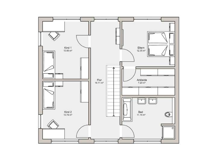 Im Obergeschoss steht das Wohlbefinden jedes einzelnen Familienmitglieds im Vordergrund. Die Räume der Kinder sind großzügig gestaltet und sind ein angenehmer Rückzugsort. Das Elternschlafzimmer verfügt über ein angrenzendes Ankleidezimmer. Im Wellness-Bad kann die ganze Familie nach Herzenslust die Seele baumeln lassen.