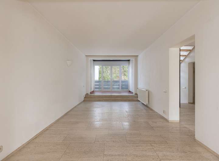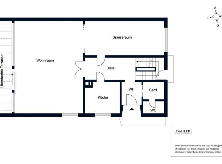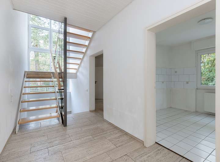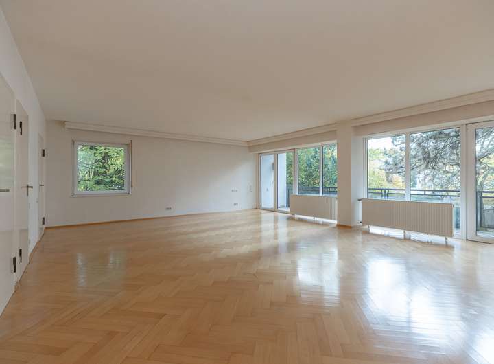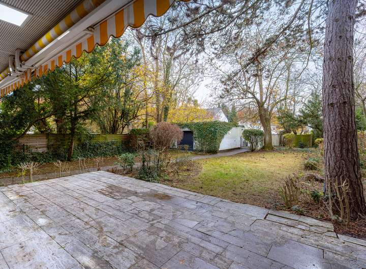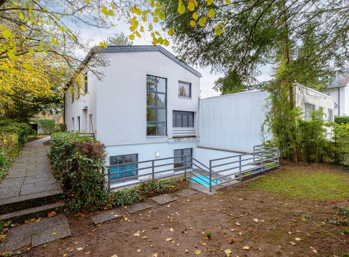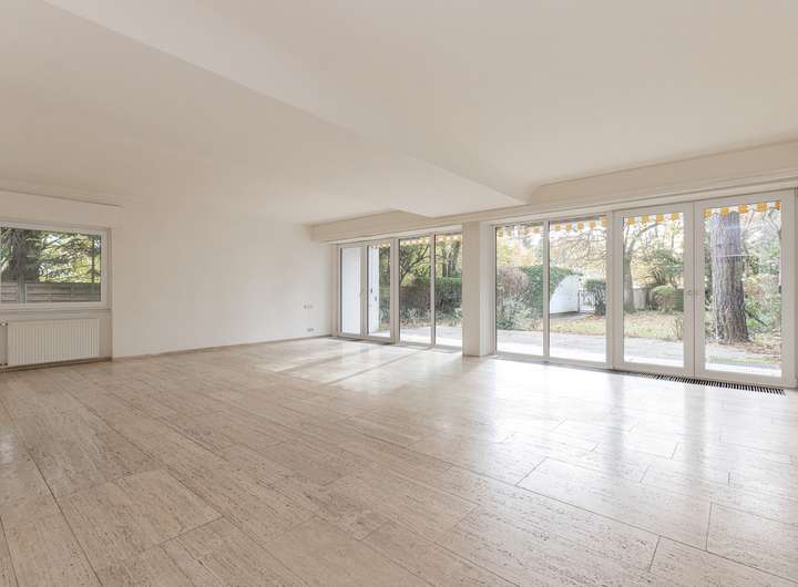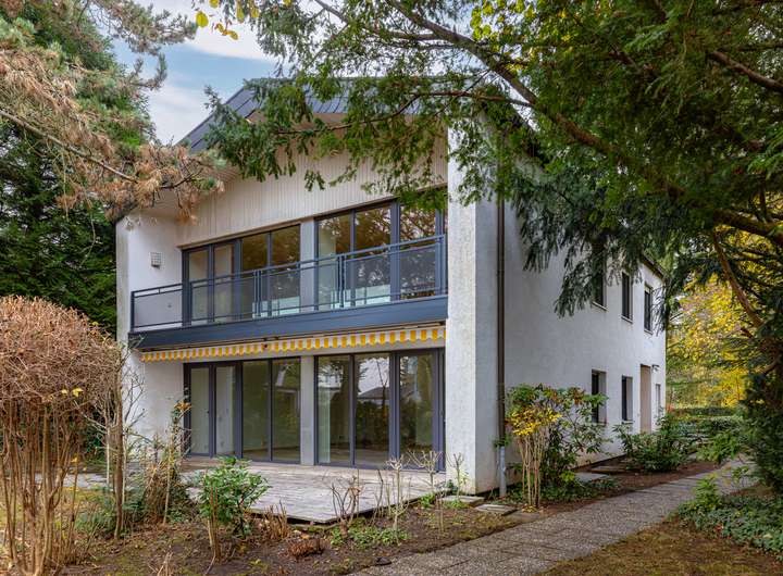Schon beim Betreten überzeugt die Villa durch das offene Raumkonzept und enorme Helligkeit durch eine große, bodentiefe und über die ganze Breite des Wohnbereichs gewählte Fensterfront. Der großzügige Wohn- & Essbereich bildet dabei das Herzstück des Erdgeschosses und bietet zahlreiche Möglichkeiten sich frei in der Gestaltung zu verwirklichen. Ein Teil des Raumes ist galant um die Ecke geplant und bietet zusätzlichen Raum für eine Bibliothek oder einen separaten Speiseraum, an die ein kleiner Wintergarten angrenzt. Die Küche ist in diesem Fall ein separater Raum, könnte aber in das Konzept integriert werden, zudem befindet sich hier noch eine Garderobe und ein Gäste-WC. Vom Wohnbereich aus erreicht man die große Terrasse mit südlicher Ausrichtung. Hier sitzt man schön im Freien, blickt in den großen, grünen Garten und kann entspannte Stunden im Freien genießen.