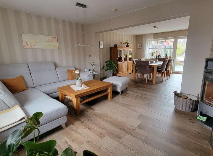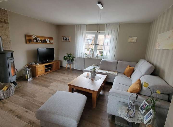 Im Wohn-/Esszimmer wurde eine elektrische Fußbodenheizung verbaut. Zusätzlich sorgt ein Kaminofen für wohlige Wärme.