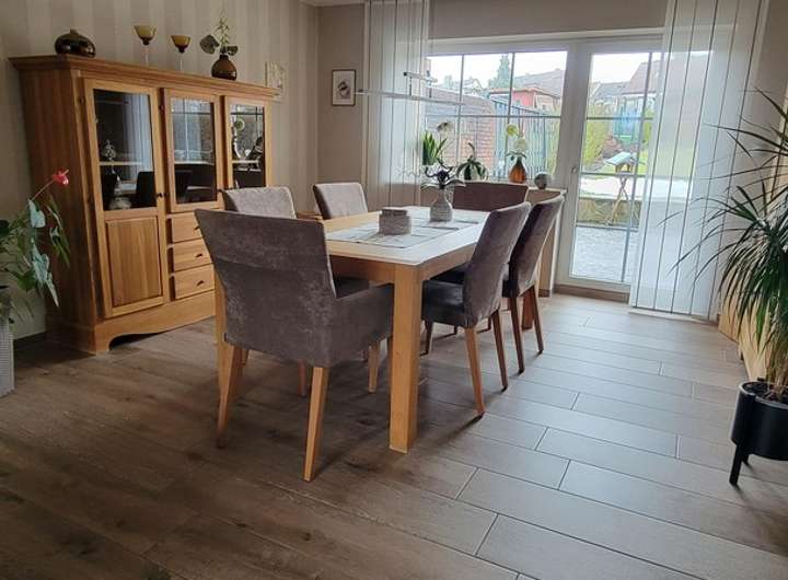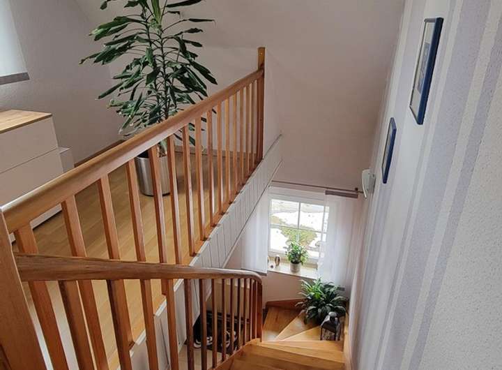 Das EG ist mit Fliesen in Holzoptik ausgestattet. Die Holztreppe ins OG wurde geschliffen und versiegelt.