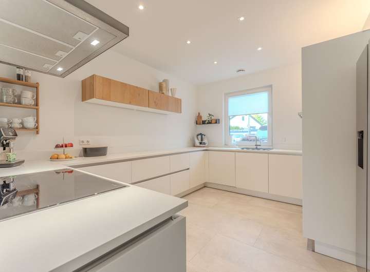 Der offene Wohn- und Essbereich ist großzügig geschnitten und bietet viel Platz für gemütliche Stunden mit Familie und Freunden. Ein Gäste-WC sowie hochwertige Nolte-Küche mit Markengeräten runden das Erdgeschoss ab.