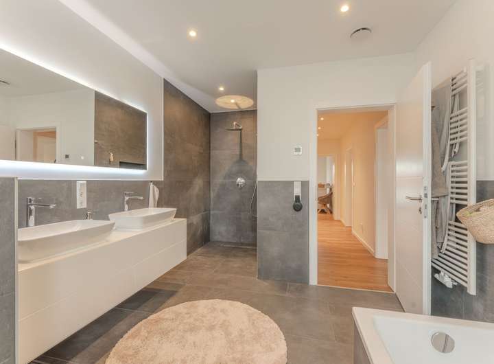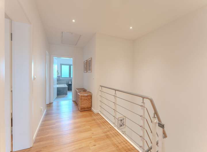 Die Fenster sind 3-fach verglast und mit elektrischen Alu-Rollläden ausgestattet, die für angenehme Ruhe und Privatsphäre sorgen. Dank Fußbodenheizung herrscht zu jeder Jahreszeit wohlige Wärme.