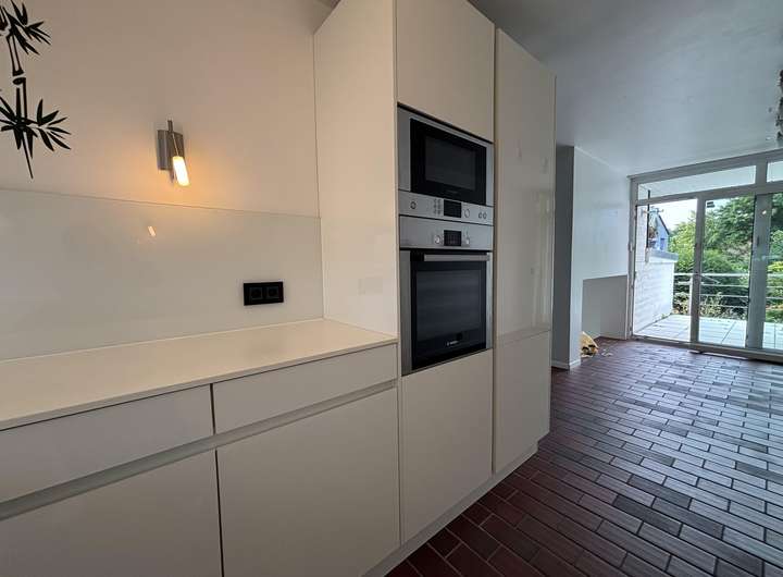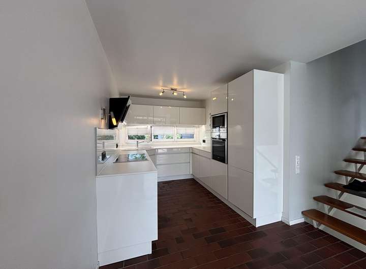 Die Küche ist durch eine Halbetage erhöht mit dem Wohnbereich verbunden und mit einer hochwertigen Einbauküche bestückt. Die angrenzende, Terrasse sorgt für viel natürliches Licht im Küchenbereich und schafft gleichzeitig einen separaten Bereich für Mahlzeiten im Freien.