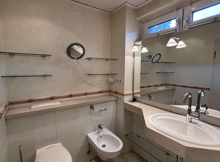 Im Eingangsbereich des Hauses befindet sich ein praktisches Gäste-WC und das Gästezimmer, welches je nach Bedarf flexibel genutzt werden kann. Der offene Charakter des Erdgeschosses mit Zugang zum Garten lädt zu gemütlichen Abenden ein, an denen sich Familie und Freunde gerne zusammenfinden.