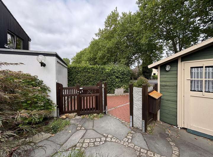 Ein Gartenhaus bietet Platz für Fahrräder oder zusätzliche Stauraum. Die Garage mit elektrischem Tor ergänzt das Grundstück und macht den Alltag besonders komfortabel.