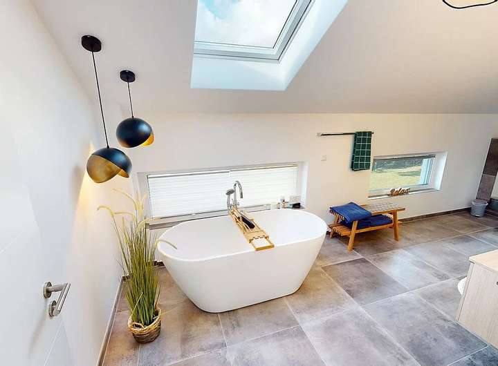 - 5 Schlafzimmer, 1 Badezimmer (mit Dusche, Wanne und Fenster) + Gäste-WC
