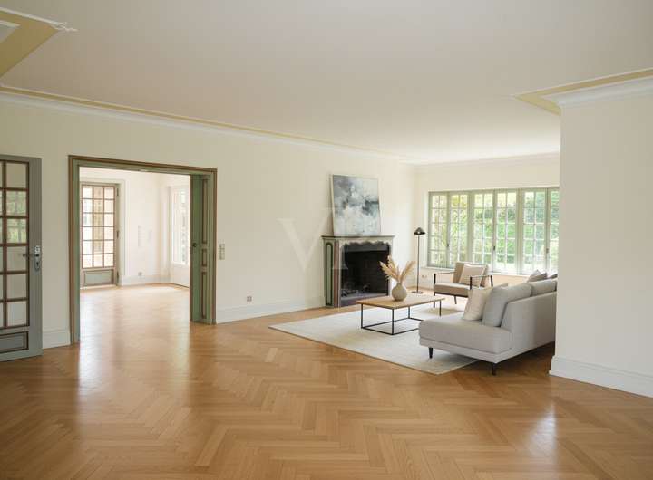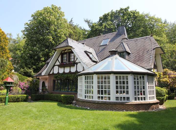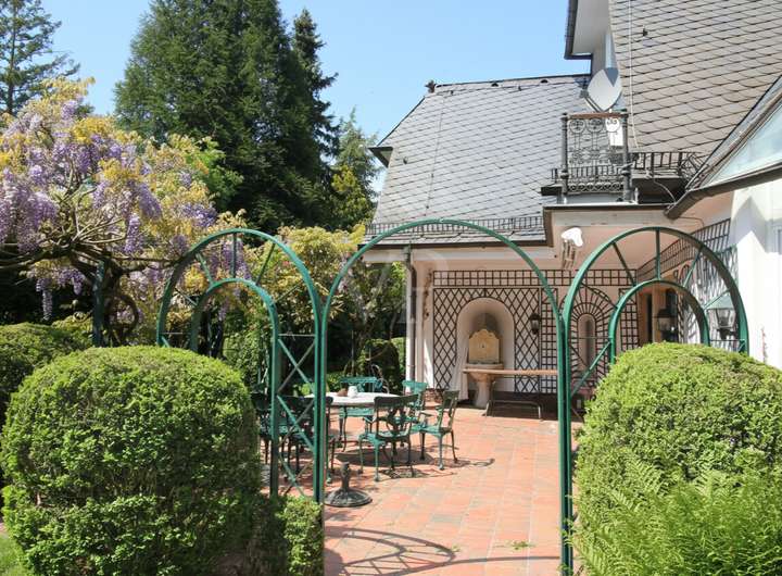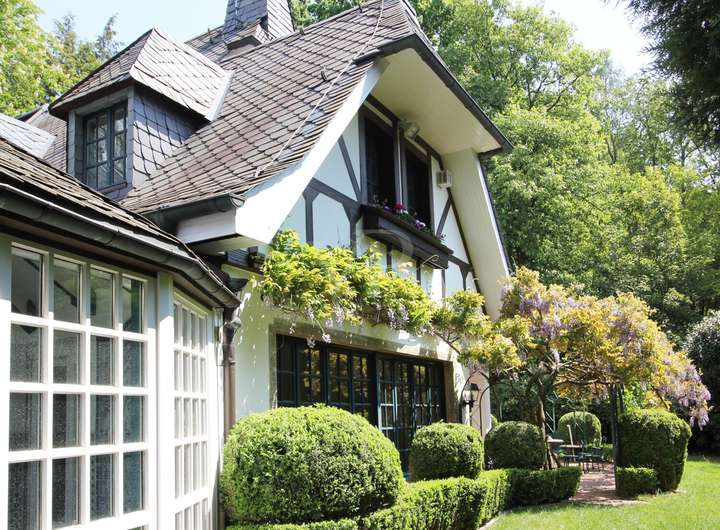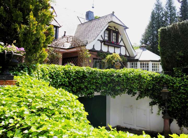 Diese Villa ist durch ihre repräsentative und malerische Fassade mit dem soliden Schiefer-Walmdach und den traditionellen Fachwerkelementen besonders charakteristisch. Sie befindet sich in einer exklusiven und ausgesprochen ruhigen Villenlage im Hardtwald. Das gärtnerisch exquisit angelegte Grundstück verfügt über einen eigenem Zugang zum Hardtwald.