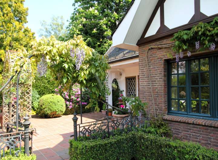 Das Entrée des Hauses mit Gäste-WC und Garderobenbereich führt in eine imposante Eingangshalle. Danach betreten Sie den großzügigen Wohn- und Essbereich, der mit einem Kamin ausgestattet ist. nach Süden ausgerichtet umrahmt von Glyzinien, liegt eine große Terrasse. Von hier hat man einen schönen Blick in den Garten. Berankte Spaliere, Gartenornamente und gusseiserne Skulpturen erzeugen Atmosphäre. Ein zweiter Terrassenbereich an der Küche bietet sich als Frühstücksterrasse an. Die Küche ist mit einer Einbauküche ausgestattet, ein praktischer Vorratsraum schließt sich direkt an.