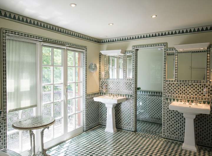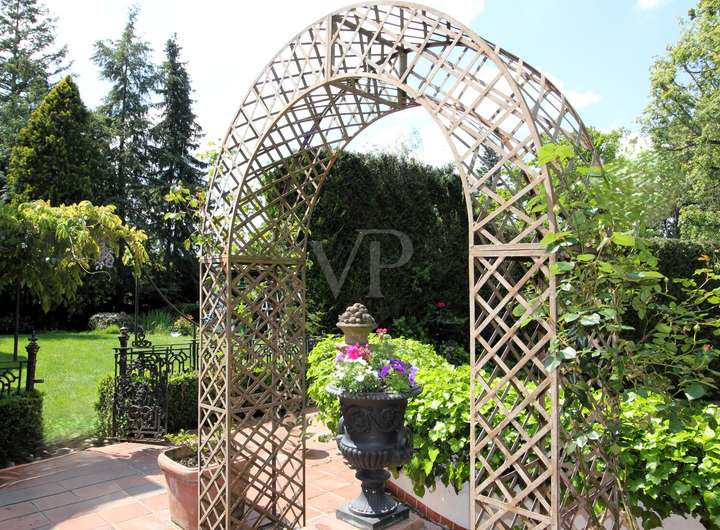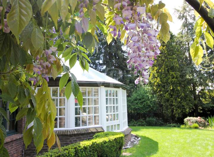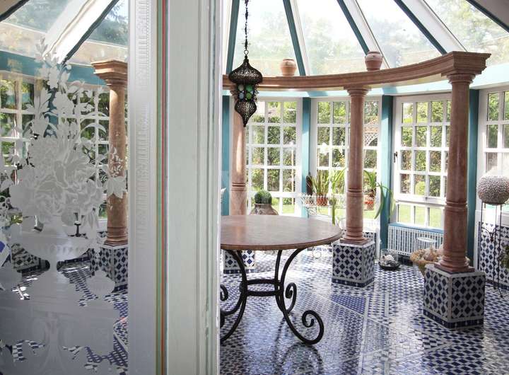 Ein absolutes Highlight ist der Wintergarten am Wohnzimmer: Flügeltüren mit verzierten Glaseinsätzen öffnen sich zu dem mit Säulen, marokkanischen Wandbildern und Mosaikfliesen dekorierten Raum. Von hier aus können Sie den Garten zu jeder Jahreszeit genießen. Am Esszimmer liegt ein zweiter Wintergarten, der als Arbeitszimmer oder Bibliothek genutzt werden kann.