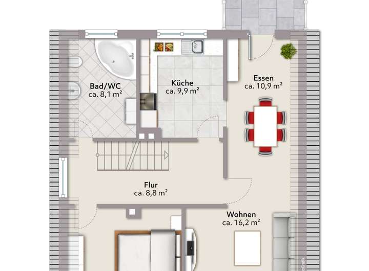 Im Dachgeschoss befinden sich ein Schlafzimmer, ein Wohn- und Esszimmer, ein großes Wannenbad mit Fenster sowie eine Küche und die großzügige Dachterrasse.