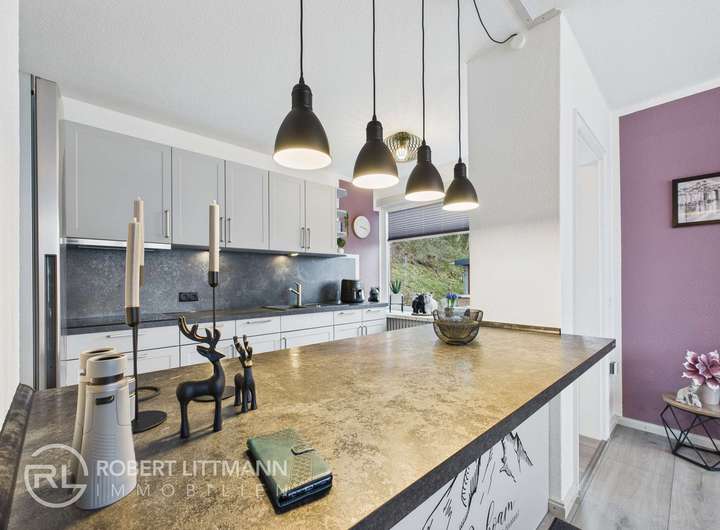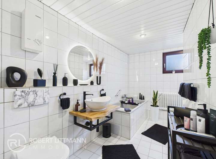 Das Wohnzimmer bildet das Herz des Hauses und ist über einen Durchgang aus Naturstein-Ziegeln elegant mit dem Essbereich und der Wohnküche verbunden – ein architektonisches Detail, das Charakter und Stil verleiht. Ein integrierter Küchentresen trennt Küche und Essbereich auf harmonische Weise und schafft gleichzeitig Offenheit für Kommunikation und geselliges Beisammensein. Vom Wohnzimmer gelangt man direkt auf den Balkon, der den Ausblick ins Grüne vollendet und zum Verweilen einlädt. Ergänzt wird diese Ebene durch ein geräumiges Gäste- oder Kinderzimmer, das dank durchdachter Gestaltung und liebevollen Details besonders wohnlich wirkt. Das komfortable Wannenbad mit Fenster und Platz für eine Waschmaschine lässt keinerlei Wünsche offen.