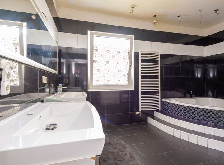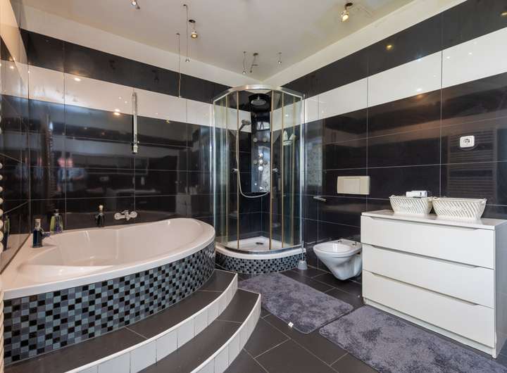 - Badezimmer mit Dusche und Eckbadewanne