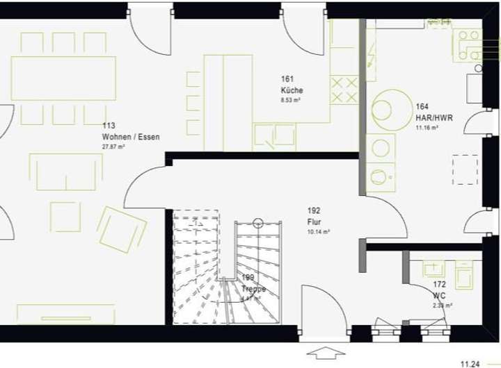 Unsere projektierten Ausbauhäuser sind von außen fertig verputzt, mit Fenstern, Eingangstür, Dacheindeckung und Dachrinnen. Die Heizungsanlage mit Fußbodenheizung, mit kompletter Elektroinstallation, sowie der Buche-Holztreppe EG/DG sind inkl. Montage enthalten.