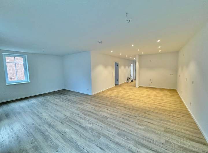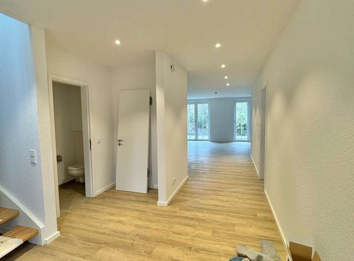 Im Erdgeschoss betreten Sie die Wohnräume über einen einladenden, großzügigen Eingangsbereich mit Flur. Von hier aus gelangen Sie in das helle, weitläufige Wohnzimmer mit offener Küche.