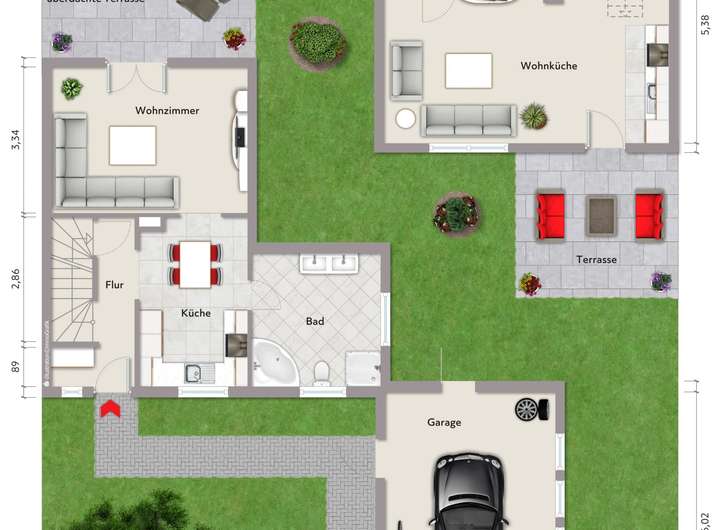 EG: Wohnküche, Bad, Eingangsbereich/Garderobe; Terrasse