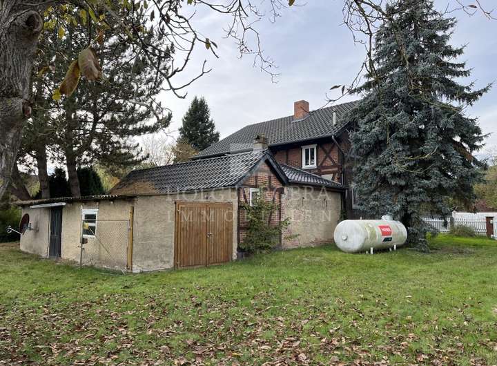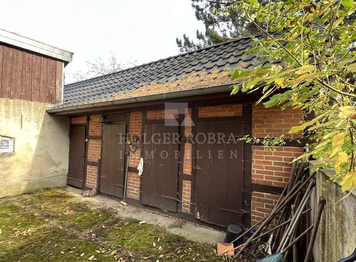 Unmittelbar hinter dem Haus gibt es ein kleines Fachwerk-Nebengebäude zur Nutzung als Abstellfläche. Daran ist eine Zweifachgarage angebaut. Weiterhin steht auf dem Grundstück ein alter Hühnerstall in sehr einfacher Bauweise.
