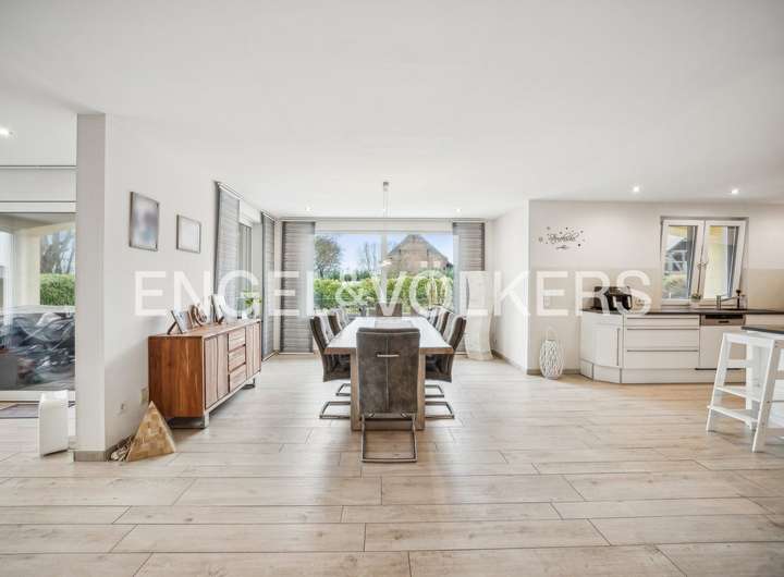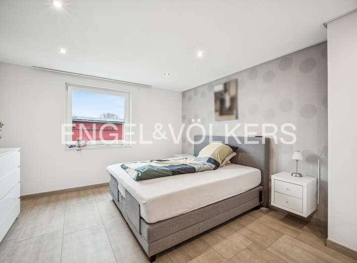 Im Erdgeschoss erwartet Sie ein lichtdurchfluteter Wohn‑ und Essbereich mit großen Fensterfronten und Kamin. Die offene Küche fügt sich harmonisch in das Raumkonzept ein. Ein zusätzliches Zimmer sowie ein Gäste‑WC ergänzen diese Ebene. Praktische Nebenräume wie Hauswirtschaft‑ und Technikbereiche bieten wertvolle Zusatzfläche.