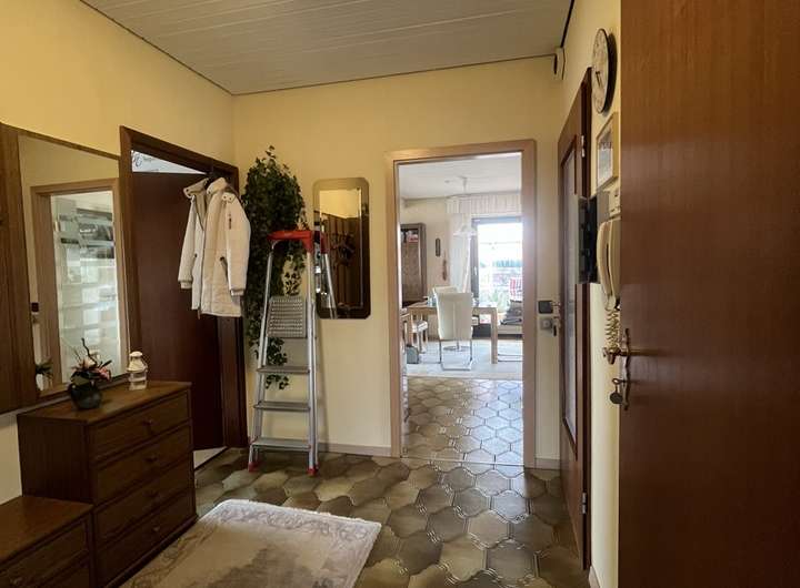 Das Einfamilienhaus mit Einliegerwohnung präsentiert sich beim Betreten mit einem einladenden und hellen Eingangsbereich, der durch große Fenster viel Tageslicht hereinlässt.
