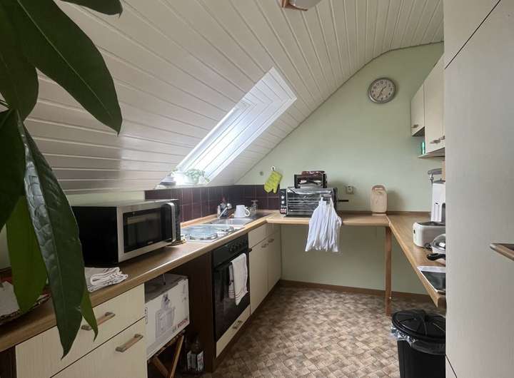 Das Obergeschoss ist als separate Wohnung konzipiert und verfügt über eine Küche sowie weitere Wohnräume. Die flexible Grundrissgestaltung ermöglicht es den Bewohnern, die Räume nach ihren individuellen Bedürfnissen anzupassen und zu verändern, sei es für zusätzlichen Wohnraum oder für Büro- und Arbeitsbereiche.
