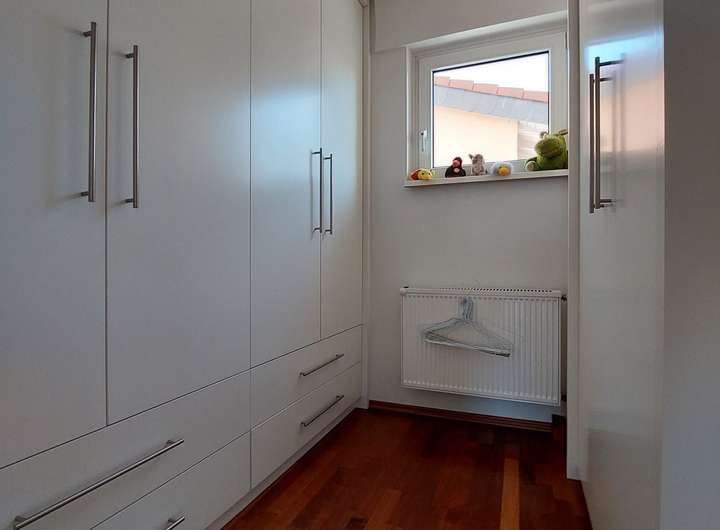 OG: drei großzügige Zimmer (alle mit Balkonzugang), ein Ankleidezimmer, ein großes Badezimmer mit freistehender Badewanne und separater Dusche.
