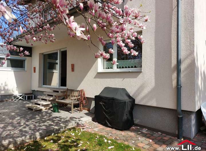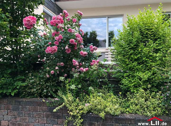 Der nach Süd-Westen ausgerichtete Garten mit großer Terrasse lädt im Sommer zum Verweilen ein. Auf dem Grundstück befindet sich eine Garage und ein davorliegender Stellplatz.