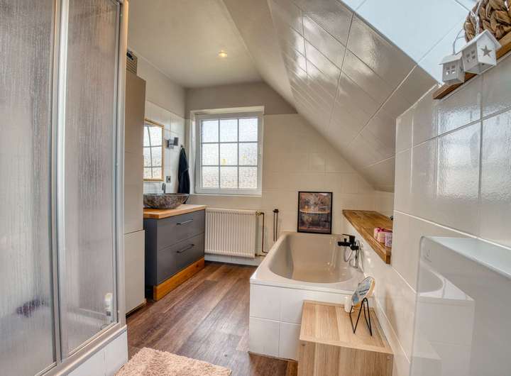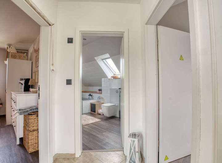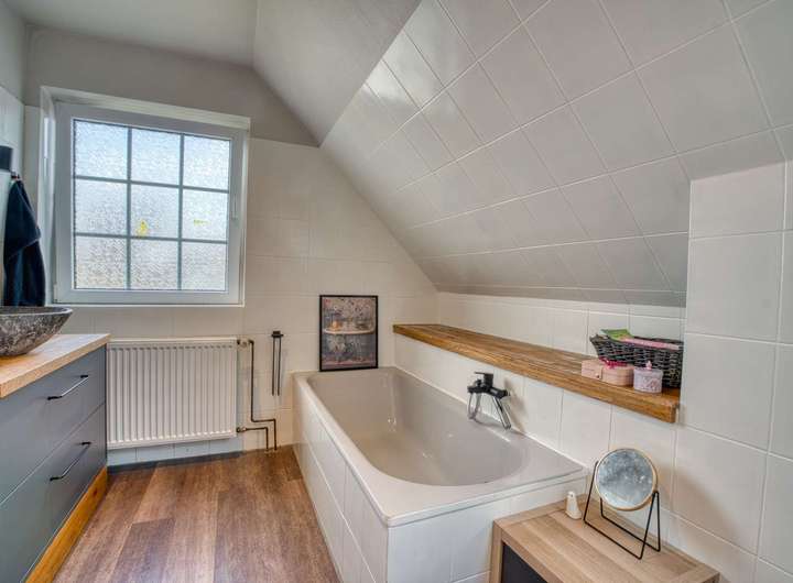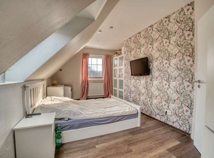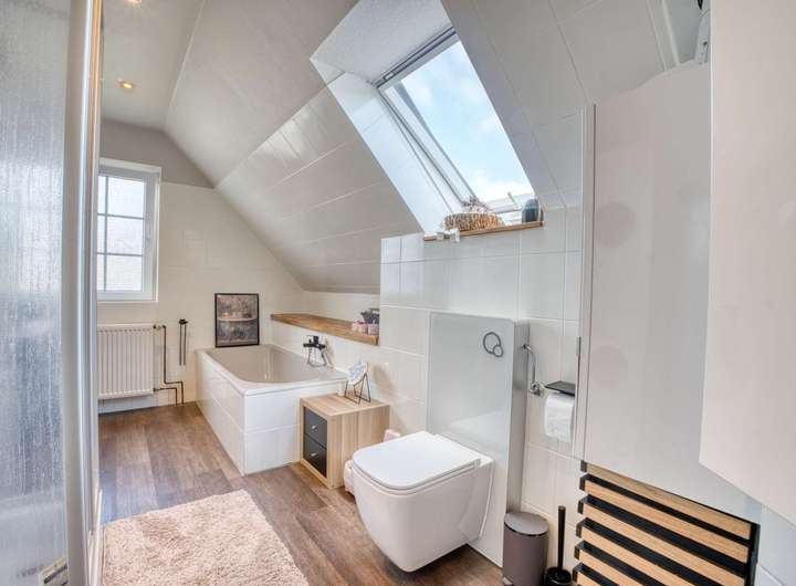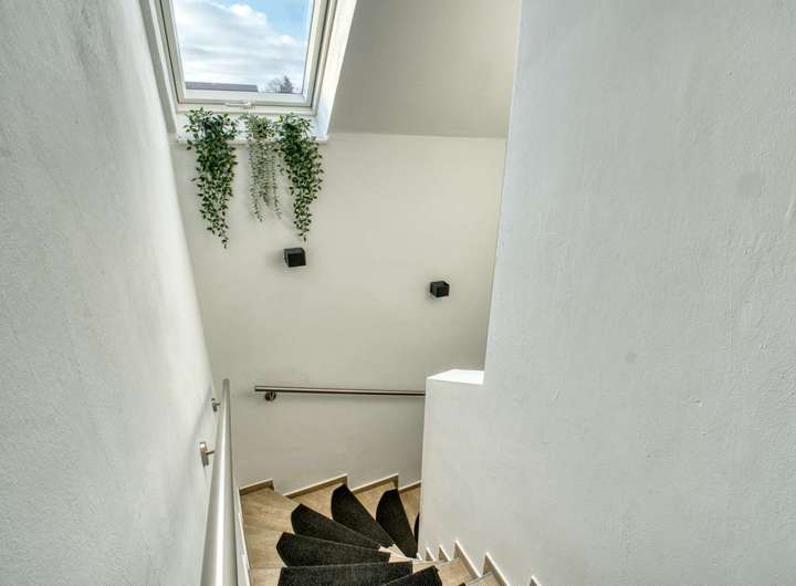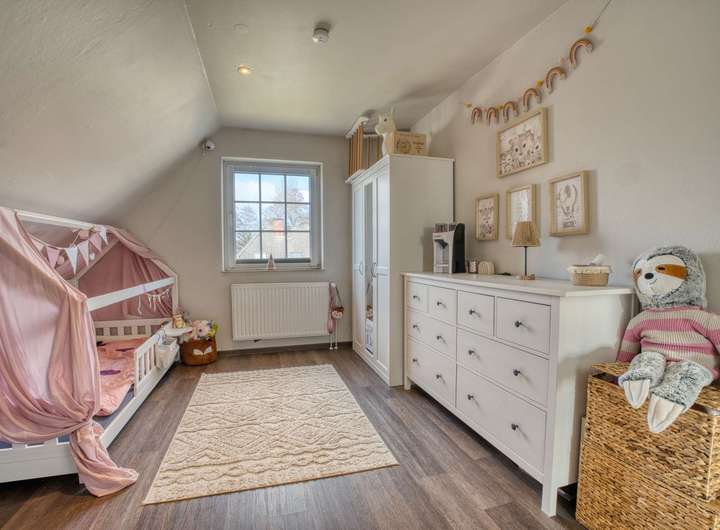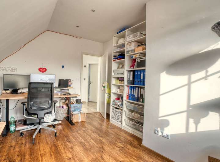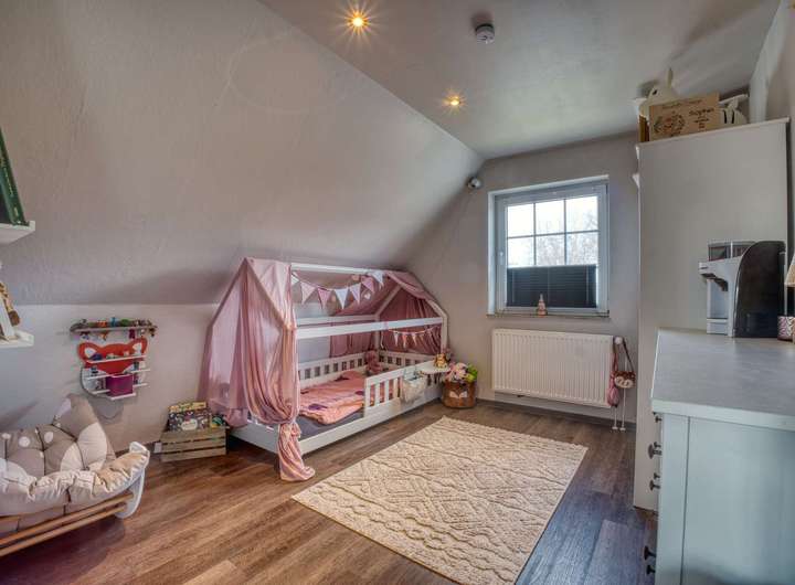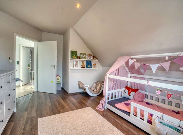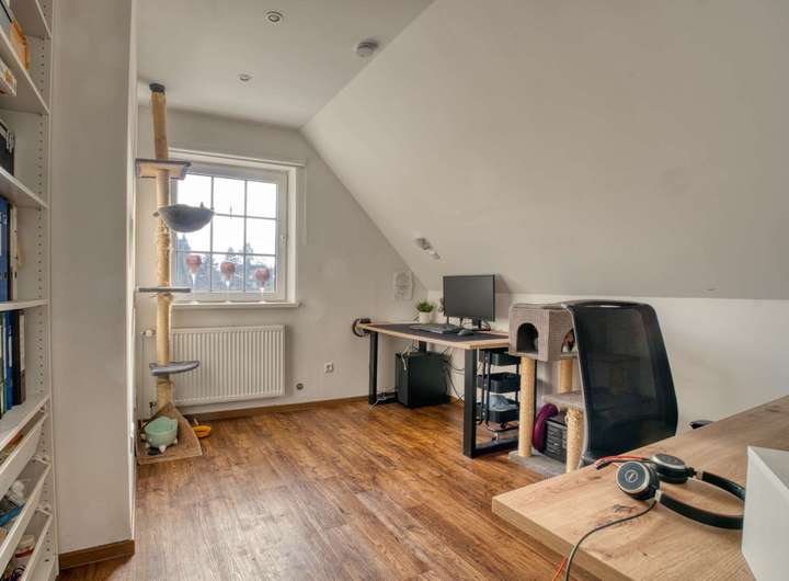 Im Obergeschoss stehen drei gut geschnittene Räume zur Verfügung, die flexibel als Schlaf-, Kinder- oder Arbeitszimmer genutzt werden können. Das großzügige Badezimmer ist mit einer Duschwanne sowie einer separaten Duschkabine ausgestattet. In den Dachschrägen wurden neue Kunststofffenster eingebaut, die für eine angenehme Belichtung sorgen. Neue Bodenbeläge sowie frisch gestrichene Wände und Decken unterstreichen den gepflegten Gesamteindruck. Technisch ist die Immobilie ebenfalls auf einem aktuellen Stand: Die Vaillant-Heizungsanlage wurde 2022 erneuert, sodass in den kommenden Jahren kein größerer Modernisierungsbedarf zu erwarten ist.