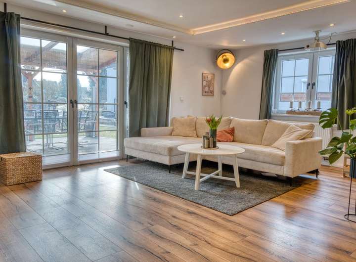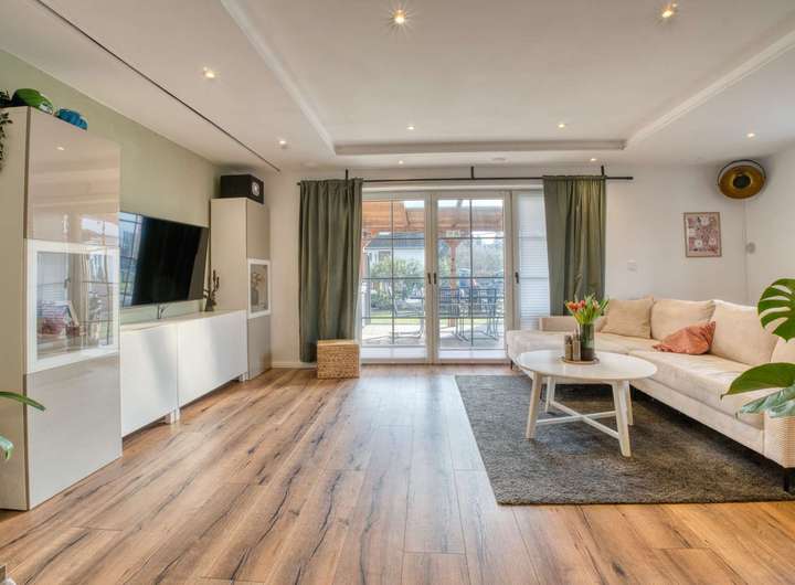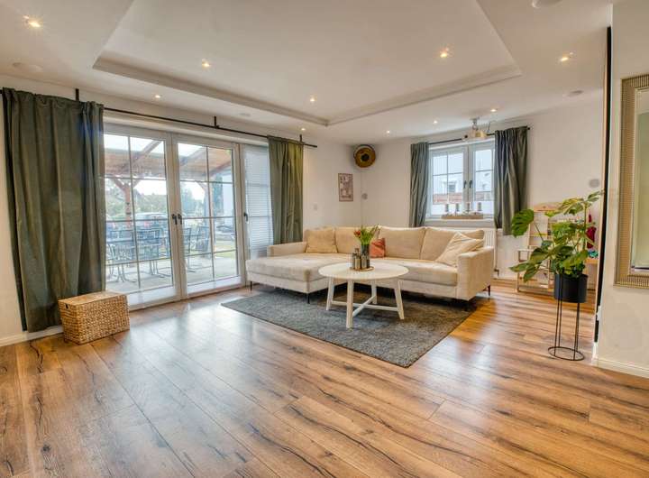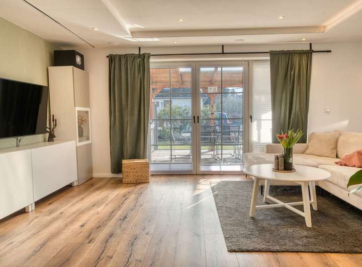 Das Wohnzimmer bildet das Herzstück des Hauses und überzeugt insbesondere Technikliebhaber: Eine aus der Decke fahrbare Leinwand, ein dezent integriertes Soundsystem in Decke und Wand sowie die vorbereitete Halterung für einen Deckenbeamer schaffen ein exklusives Heimkino-Erlebnis für Familienabende oder gesellige Filmnächte. Von hier aus gelangen Sie direkt in den überdachten, südlich ausgerichteten Terrassenbereich, der einen fließenden Übergang zwischen Innen- und Außenraum ermöglicht.