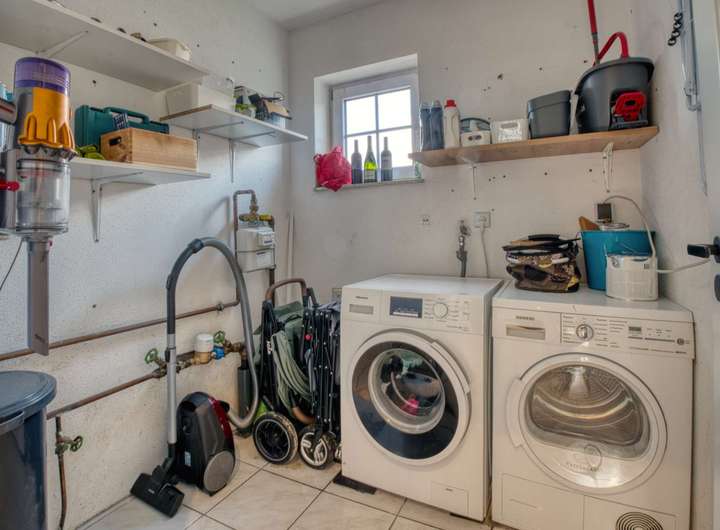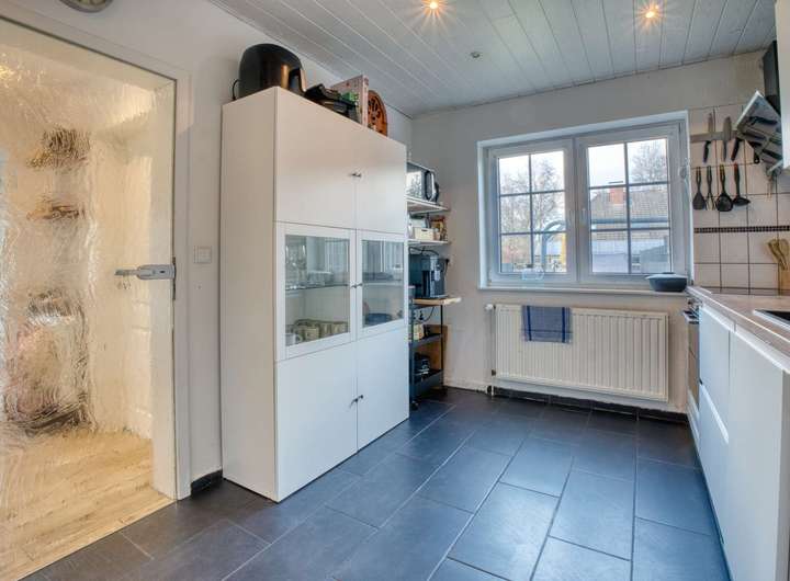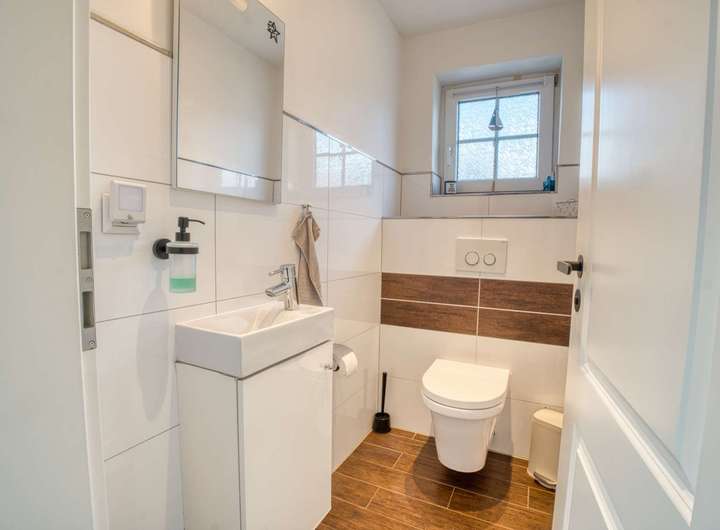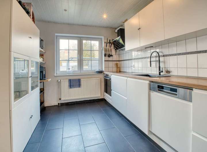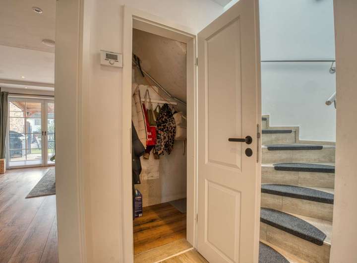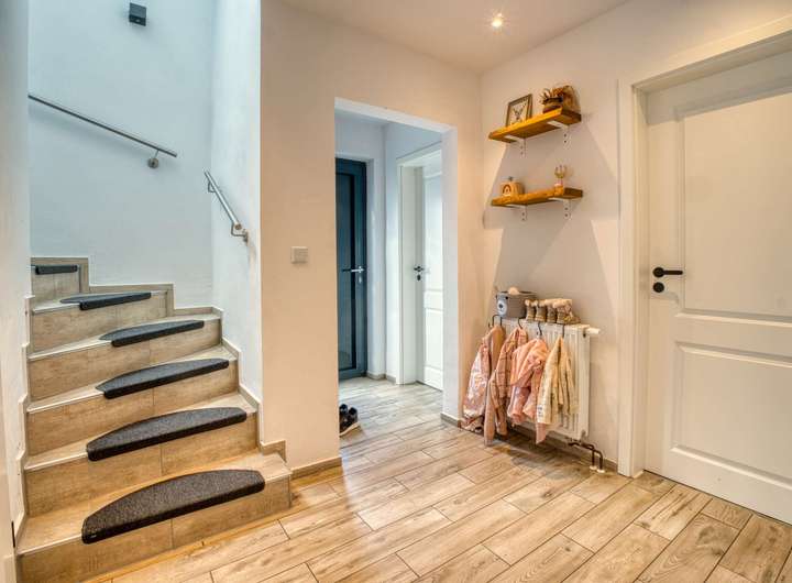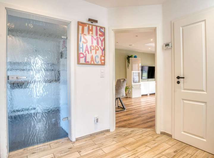 Im Erdgeschoss empfängt Sie ein stilvoll gefliester Eingangsbereich, dessen hochwertige Fliesen sich über die Treppenstufen fortsetzen und dem Haus eine klare, moderne Linie verleihen. Ein modernisiertes Gäste-WC sowie ein separater Hauswirtschaftsraum mit Anschlüssen für Waschmaschine und Trockner und zusätzlichem Stauraum sorgen für alltagstaugliche Funktionalität. Die Küche wurde in den Jahren 2024 erneuert und präsentiert sich zeitgemäß und hochwertig. Nahezu alle Innentüren wurden durch elegante Landhaustüren ersetzt, was dem gesamten Wohnbereich eine stimmige, wertige Atmosphäre verleiht.