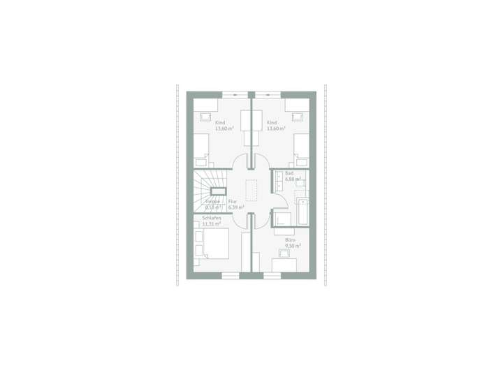 Dieses klassische Satteldachhaus mit rund 122 m² Nettogrundfläche ist bewusst kompakt geplant und überrascht zugleich mit einem durchdachten Raumgefühl. Jeder Quadratmeter ist so gestaltet, dass er sich gut anfühlt - funktional, hell und einladend. Im Erdgeschoss schafft eine großzügige Wohnküche mit Kochinsel den Mittelpunkt des Familienlebens. Große Fensterflächen holen Licht und Leben ins Haus, die angrenzende Terrasse erweitert den Raum ins Freie. Praktisch und einfach zugleich: Eine separate Speisekammer sowie ein Dusch-WC bieten zusätzlichen Komfort. Oben findet jeder seinen Platz. Zwei Kinderzimmer, ein Elternzimmer und ein weiteres, vielseitig nutzbares Zimmer - etwa als Büro oder Rückzugsort, sowie ein großzügiges Duschbad vervollständigen das Familiengeschoss. Die Atmosphäre? Klar strukturiert, gemütlich und echt.