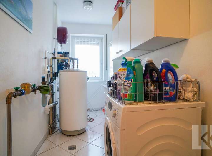 Bereits beim Betreten des Hauses wird die klare Struktur spürbar. Der Eingangsbereich bietet Platz für eine Garderobe und führt direkt in das modern gestaltete Tageslichtbad mit Dusche – praktisch im Alltag oder für Gäste. Gegenüber befindet sich die Küche, die durch den angrenzenden Hauswirtschaftsraum sinnvoll ergänzt wird. Von hier aus besteht ein direkter Zugang zur integrierten Garage sowie zu einem zusätzlichen Abstellraum – kurze Wege, durchdacht geplant. Der gesamte Flur ist mit hochwertigem Marmorino Putz verputzt.