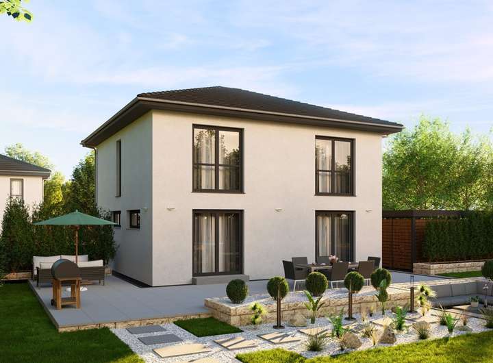 Im Stil einer modernen Stadtvilla gehalten, überzeugt das Einfamilienhaus mit seinen rund 150 m² Wohnfläche und eignet sich ideal für Familien, die das Plus an Komfort genießen möchten. Im Erdgeschoss befindet sich der offene Wohn-Ess-Kochbereich, der dank der bodentiefen Fenster nicht nur in natürlichem Tageslicht erstrahlt, sondern auch einen direkten Zugang zum Außenbereich bietet. Die großzügige Küche verfügt über eine praktische Kochinsel und ist mit einer separaten Speisekammer ausgestattet, die optimalen Platz und zahlreiche Stauraumoptionen bereithält. Neben der Diele und einem Gästebad bietet das Erdgeschoss einen Hauswirtschaftsraum (HWR), welcher als Waschraum nutzbar ist. Im Obergeschoss befinden sich zwei geräumige Schlafzimmer sowie ein weiterer Raum, der sich ideal als Büro oder Hobbyraum eignet. Ein Highlight stellen sowohl das großzügige Bad inklusive Dusche und Badewanne sowie das Elternzimmer, welches über einen eigenen Ankleidebereich verfügt, dar. Das moderne Traumhaus kann optional mit einem Keller geplant werden, der zusätzlichen Stauraum ermöglicht.