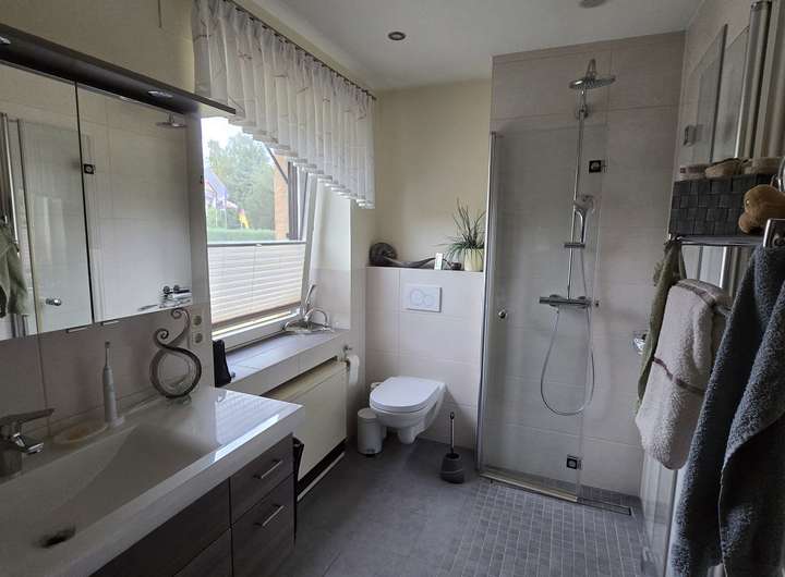 Das Badezimmer im Erdgeschoss wurde 2020 renoviert. Die weitere Ausstattung umfasst eine Stromheizung (Baujahr 2005), einen Wintergarten, eine Doppelgarage, einen Gartenteich und einen Rasenmähroboter. Die Fassade ist mit Klinker verkleidet und die Fenster bestehen aus Holz.