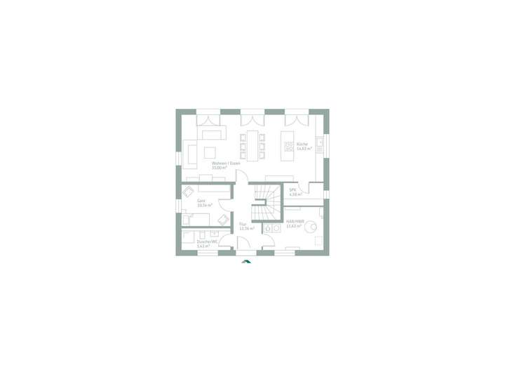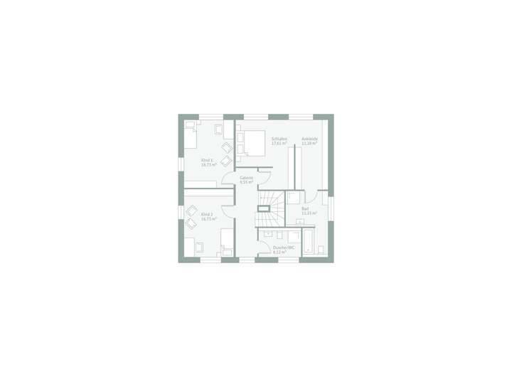 Diese Stadtvilla steht exemplarisch für ein Wohnkonzept, das sich anpasst. Der Grundriss ist großzügig, offen und gleichzeitig klar strukturiert - ideal für Familien, die Wert auf Komfort, Platz und Alltagstauglichkeit legen. Doch dieses Haus kann mehr: Es ist ein Beispiel zu unserem BausteinKonzept - und damit bewusst so dargestellt, wie es flexibel erweiterbar ist. Ob Anbau, Einliegerwohnung oder Homeoffice: Die Struktur gibt die Möglichkeit vor, Sie entscheiden, was Sie daraus machen. Schon im Eingangsbereich zeigt sich die Funktionalität des Entwurfs. Links liegt ein vollwertiges Gäste-Duschbad, rechts ein großzügiger Hauswirtschaftsraum, der so angelegt ist, dass sich hier ohne großen Aufwand ein Anbau anschließen lässt - etwa für eine Garage, ein eigenständiges Büro oder eine separate Einheit. Weiter geradeaus geht es in den offenen Wohnbereich: eine helle, kommunikative Wohnküche mit Kochinsel, angrenzender Speisekammer, Essplatz und gemütlichem, hellen Wohnbereich. Im Obergeschoss erwartet Sie ein gut gegliederter Familienbereich. Das Elternschlafzimmer verfügt über einen großzügigen Ankleidebereich und ein eigenes Bad mit Badewanne - direkt angeschlossen und trotzdem diskret getrennt. Zwei große Kinderzimmer teilen sich ein modernes Duschbad, das die Etage praktisch vervollständigt.