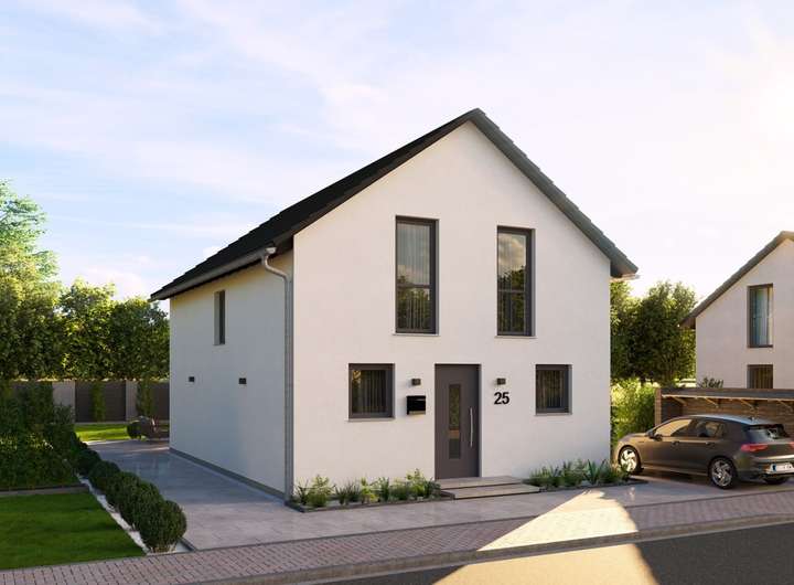 Dieses klassische Satteldachhaus mit rund 122 m² Nettogrundfläche ist bewusst kompakt geplant und überrascht zugleich mit einem durchdachten Raumgefühl. Jeder Quadratmeter ist so gestaltet, dass er sich gut anfühlt - funktional, hell und einladend. Im Erdgeschoss schafft eine großzügige Wohnküche mit Kochinsel den Mittelpunkt des Familienlebens. Große Fensterflächen holen Licht und Leben ins Haus, die angrenzende Terrasse erweitert den Raum ins Freie. Praktisch und einfach zugleich: Eine separate Speisekammer sowie ein Dusch-WC bieten zusätzlichen Komfort. Oben findet jeder seinen Platz. Zwei Kinderzimmer, ein Elternzimmer und ein weiteres, vielseitig nutzbares Zimmer - etwa als Büro oder Rückzugsort, sowie ein großzügiges Duschbad vervollständigen das Familiengeschoss. Die Atmosphäre? Klar strukturiert, gemütlich und echt.
