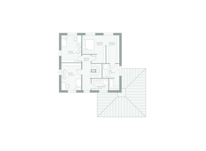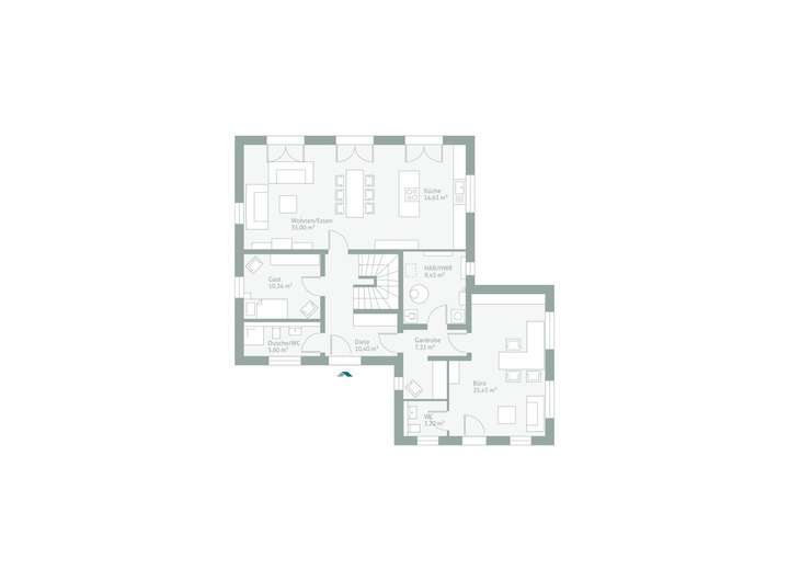 Diese Stadtvilla steht exemplarisch für ein Wohnkonzept, das sich anpasst. Der Grundriss ist großzügig, offen und gleichzeitig klar strukturiert - ideal für Familien, die Wert auf Komfort, Platz und Alltagstauglichkeit legen. Doch dieses Haus kann mehr: Es ist ein Beispiel zu unserem BausteinKonzept - und damit bewusst so dargestellt, wie es flexibel erweiterbar ist. Ob Anbau, Einliegerwohnung oder Homeoffice: Die Struktur gibt die Möglichkeit vor, Sie entscheiden, was Sie daraus machen. Schon im Eingangsbereich zeigt sich die Funktionalität des Entwurfs. Links liegt ein vollwertiges Gäste-Duschbad, rechts ein großzügiger Hauswirtschaftsraum, der so angelegt ist, dass sich hier ohne großen Aufwand ein Anbau anschließen lässt - etwa für eine Garage, ein eigenständiges Büro oder eine separate Einheit. Weiter geradeaus geht es in den offenen Wohnbereich: eine helle, kommunikative Wohnküche mit Kochinsel, angrenzender Speisekammer, Essplatz und gemütlichem, hellen Wohnbereich. Im Obergeschoss erwartet Sie ein gut gegliederter Familienbereich. Das Elternschlafzimmer verfügt über einen großzügigen Ankleidebereich und ein eigenes Bad mit Badewanne - direkt angeschlossen und trotzdem diskret getrennt. Zwei große Kinderzimmer teilen sich ein modernes Duschbad, das die Etage praktisch vervollständigt.
